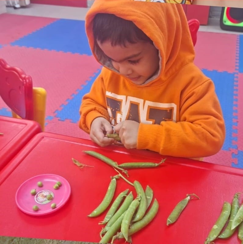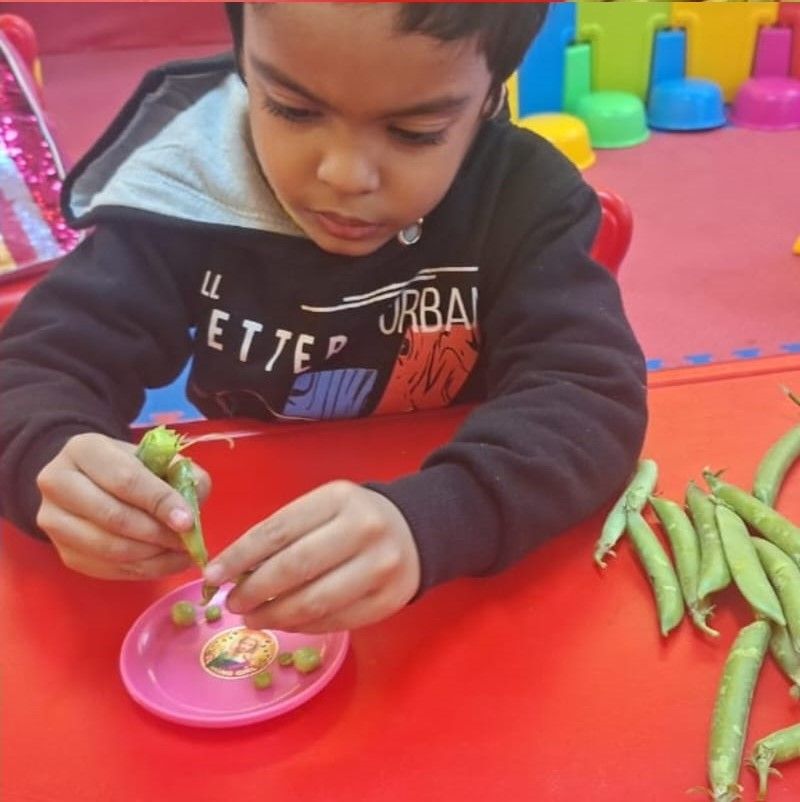 An interdisciplinary activity promoting fine motor development, concentration, and colour awareness, where our young learners joyfully engaged in peeling peas. This hands-on experience strengthened finger muscles and hand-eye coordination while encouraging focus and patience. As children observed the vibrant green peas, they enhanced their colour recognition and sensory awareness. The activity also fostered independence, life skills, and curiosity, making learning both meaningful and enjoyable through real-world exploration.