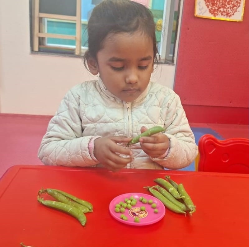 An interdisciplinary activity promoting fine motor development, concentration, and colour awareness, where our young learners joyfully engaged in peeling peas. This hands-on experience strengthened finger muscles and hand-eye coordination while encouraging focus and patience. As children observed the vibrant green peas, they enhanced their colour recognition and sensory awareness. The activity also fostered independence, life skills, and curiosity, making learning both meaningful and enjoyable through real-world exploration.